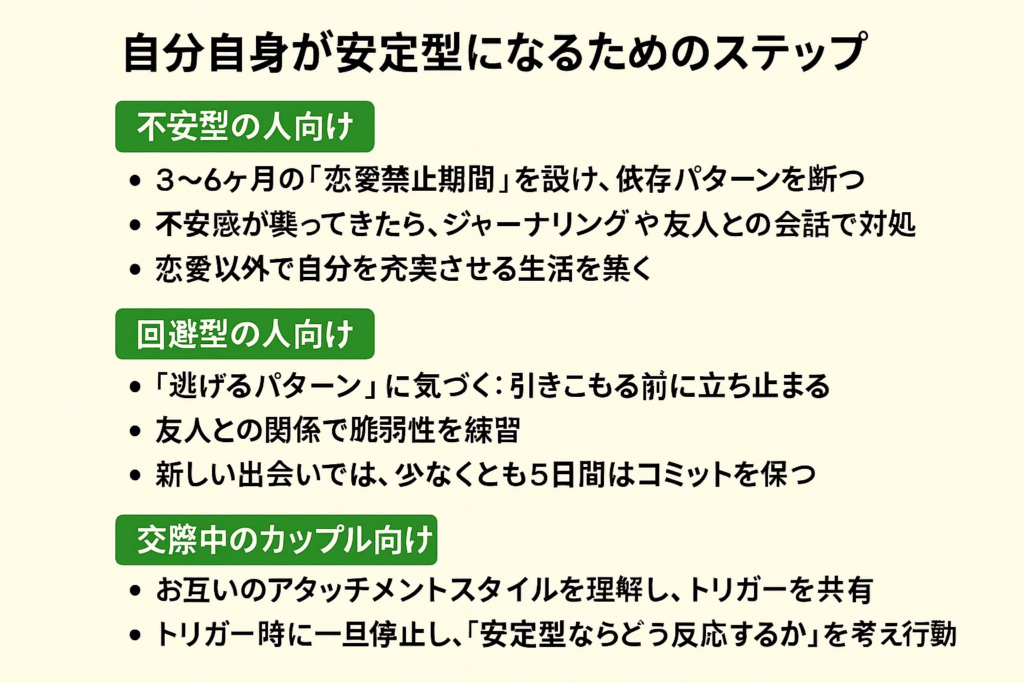 - トリガー時に一旦停止し、「安定型ならどう反応するか」を考えて行動