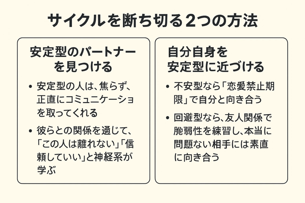 不安型は「もっと愛してほしい」と追いかけ、回避型は「もっと自由がほしい」と距離を置く。これを繰り返すうちに、どちらも「傷ついた」「息苦しい」と感じ、負のスパイラルに陥ります。
