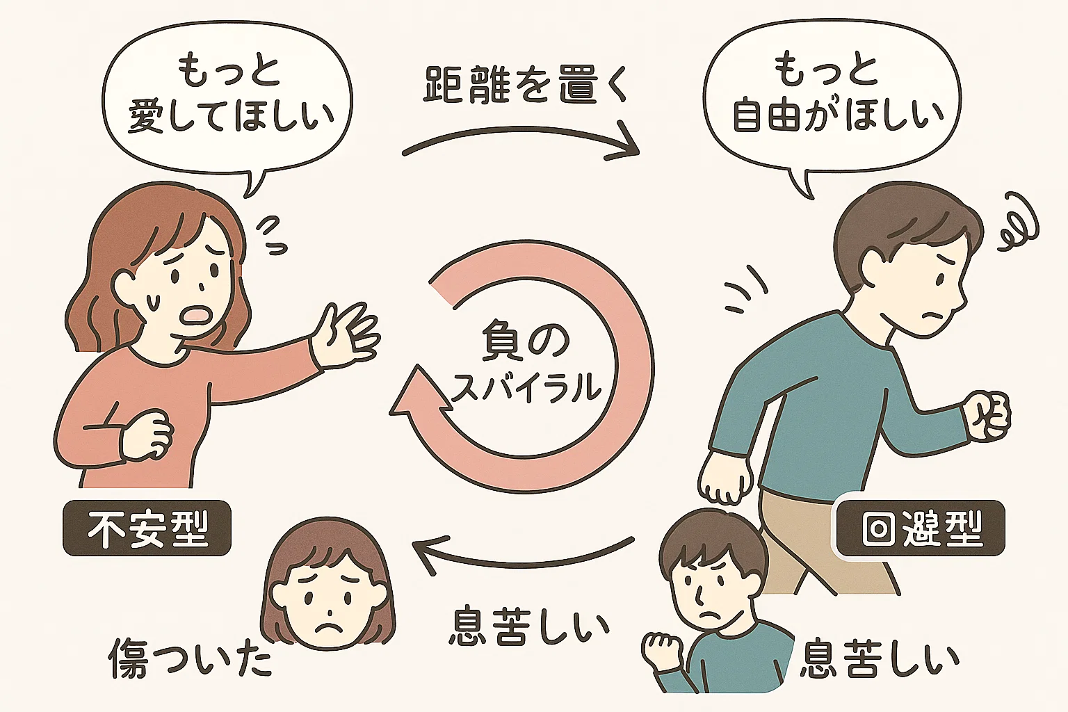 不安型は「もっと愛してほしい」と追いかけ、回避型は「もっと自由がほしい」と距離を置く。これを繰り返すうちに、どちらも「傷ついた」「息苦しい」と感じ、負のスパイラルに陥ります。