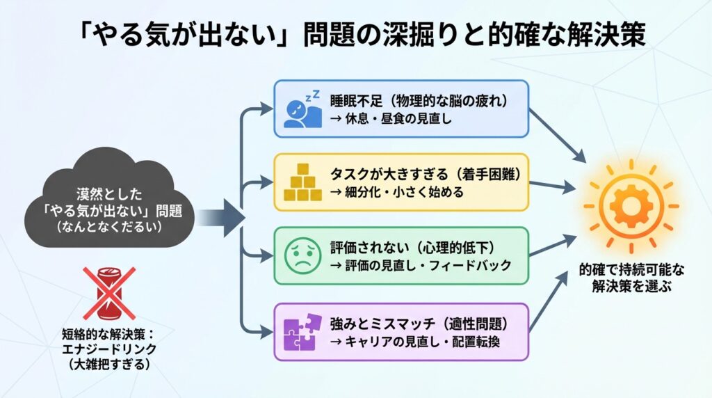 例えば、「なんとなくだるい、やる気が出ない」という問題に対し、エナジードリンクを飲むといった解決策は、原因が大雑把すぎると言えます。やる気が出ない理由は、もっと細かく切り分けられるはずです。