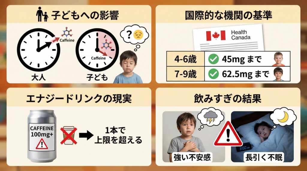 子どもは大人に比べてカフェインの影響を受けやすく、体の中で分解して外に出すのにも時間がかかります。カナダ保健省などの国際的な機関では、子どもの年齢に合わせた1日のカフェイン摂取の上限を決めています。例えば4歳から6歳なら45mg、7歳から9歳なら62.5mgまでとされていますが、エナジードリンクは1本でこの量を軽々と超えてしまうものがほとんどです。飲みすぎると、強い不安感や不眠が長く続いてしまうことがあります。