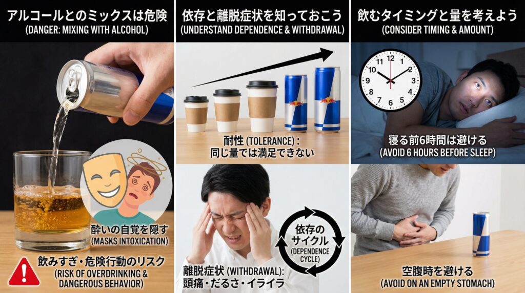 お酒とエナジードリンクを混ぜて飲むスタイルがありますが、これは避けるべき飲み方です。カフェインのシャキッとする効果が、アルコールによる酔いの自覚を隠してしまうため、実際にはかなり酔っているのに本人が気づきにくくなります。その結果、お酒を飲みすぎてしまったり、危険な行動をとったりしやすくなるという警告が出されています。