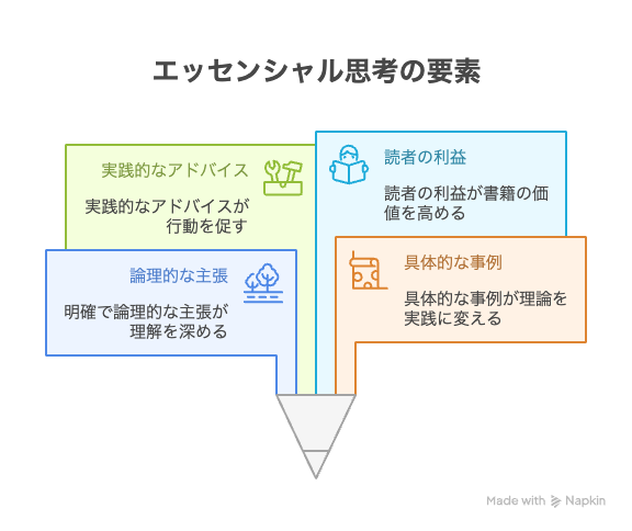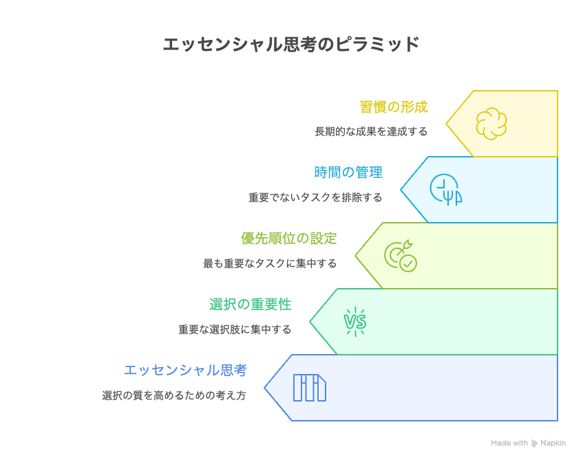 エッセンシャル思考は、単なる時間管理術ではなく、人生や仕事における「選択」の質を高めるための考え方です。重要でないことに「ノー」と言い、本当に重要なことに「イエス」と言う勇気を持つことが求められます。 - 選択の重要性