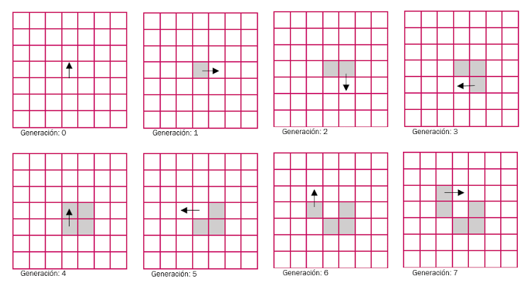 自己複製といっても、コンウェイの「ライフゲーム」のグライダーなどとは異なり、ラングトンのアリではアリ自身が“複製される”のではなく、“軌跡を生成するパターン” がシフトしながら前に進む格好です。