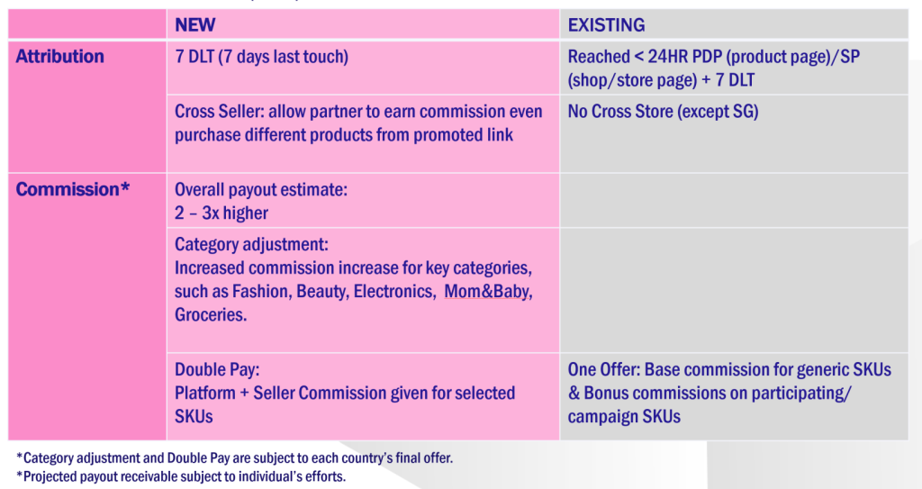 | アトリビューション | – 7 DLT(7日間ラストタッチ) – Cross Seller(紹介リンクとは異なる商品でも成果) | – <24時間でPDP/SPに到達:高報酬 – >24時間でPDP/SPに到達:通常報酬 – Cross Store:一部国のみ対応 |