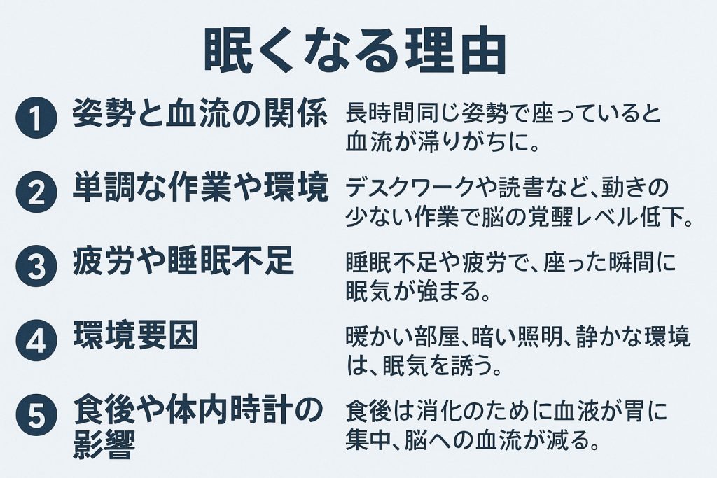 この記事では、なぜ座っていると眠くなるのか、その原因と実践的な対策をわかりやすく解説します。