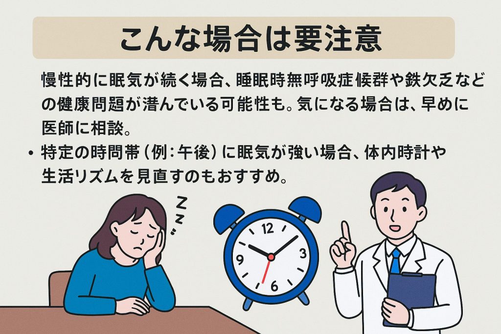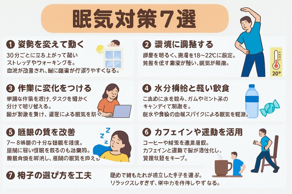 - 対策:7~8時間の十分な睡眠を確保。昼間に15~20分の短い仮眠(午後3時前まで)を取るのも効果的。