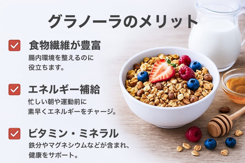 グラノーラは栄養価が高い場合が多く、以下のような利点があります: