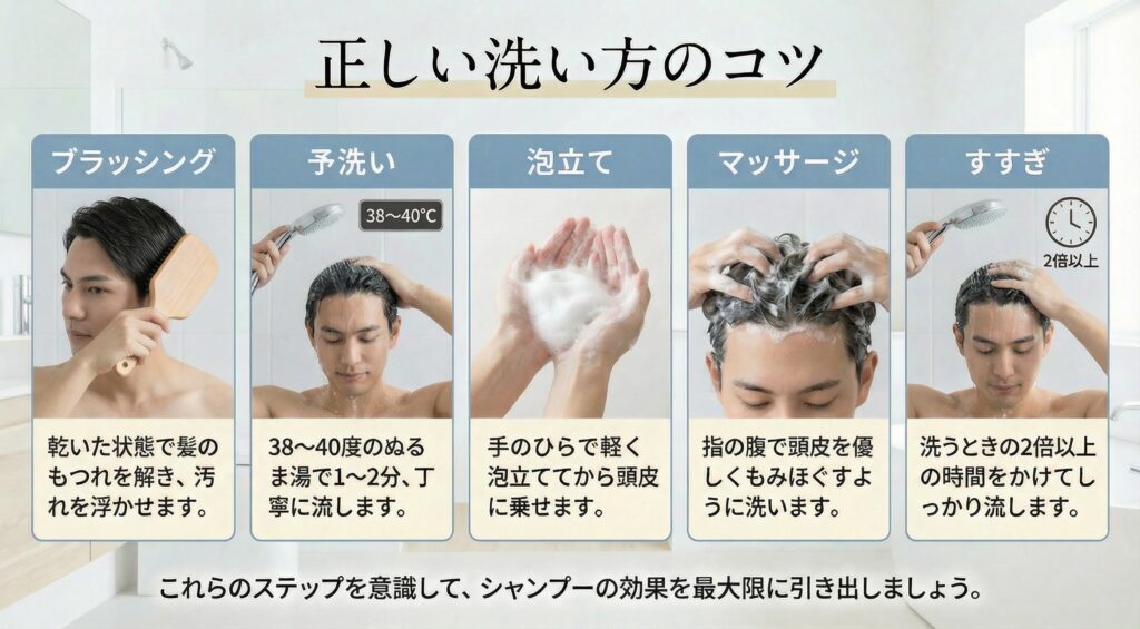 洗い方一つで、シャンプーの効果は大きく変わります。以下のステップを意識してみてくださいね。