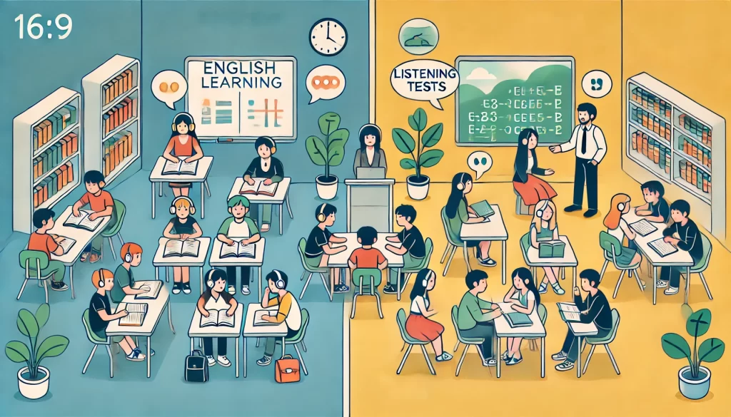 例えば、学校の英語の授業では、教科書を使った読解問題やリスニングテストが主流で、会話練習はほとんどありません。この学習スタイルは「知識としての英語」を身につけるには適していますが、「実践的な英語」を使うスキルはあまり育ちません。
