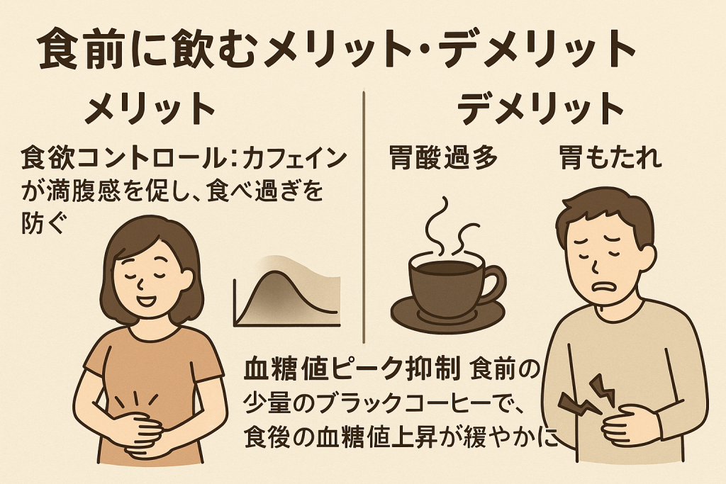 - 血糖値のピーク抑制:食前に少量のブラックコーヒーを飲むと、食後の血糖値急上昇が緩やかになるという研究報告も。