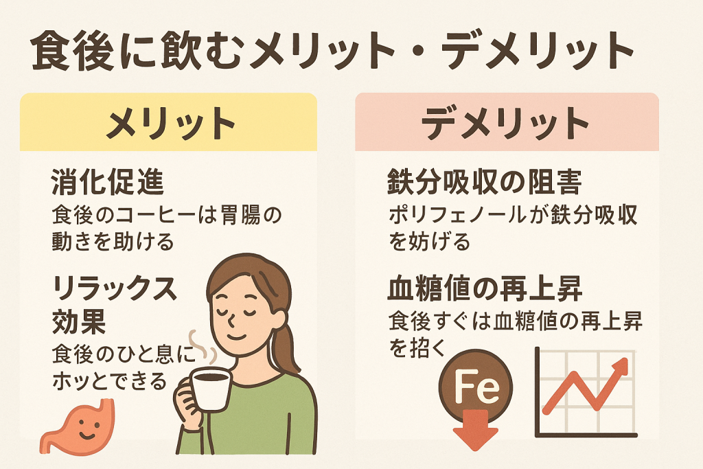 | 食後 | 食後10~30分後 or 1時間後 | ノンカフェインも併用、鉄分吸収に注意 |