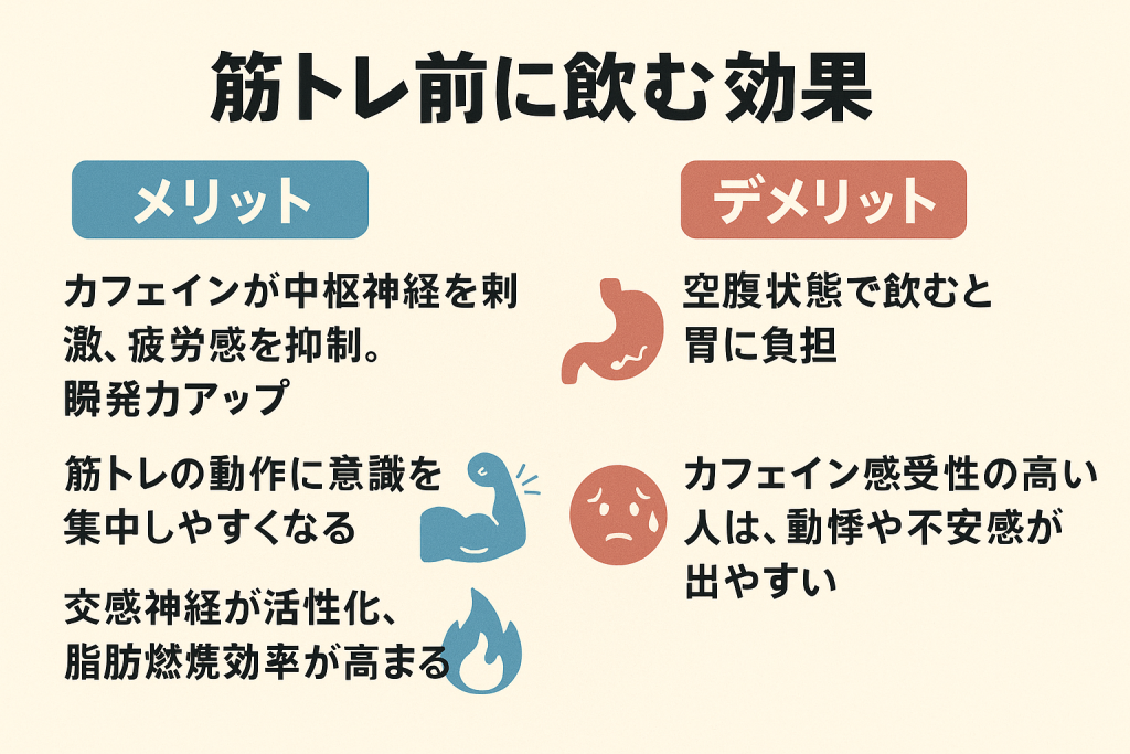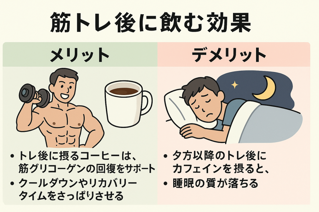 - 回復妨げの可能性:夕方以降のトレ後にカフェインを摂ると、睡眠の質が落ちることも。