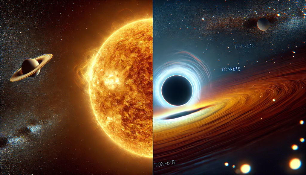 TON-618のブラックホール、どれくらい大きいかっていうと…なんと太陽の407億倍から660億倍の重さ!これ、銀河系にある全部の星(約640億個分の太陽)を合わせた重さを超えちゃうレベル。想像つかないですよね?