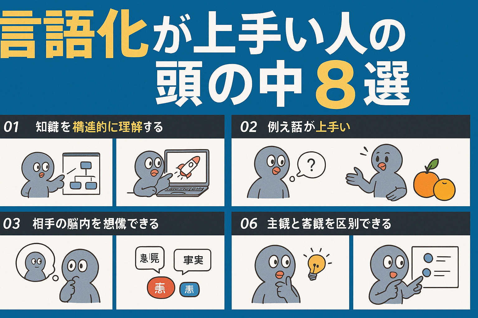 今回は「言語化が上手い人の頭の中8選」と題して、8つの視点から解説していきます。あなた自身の説明力アップや、周りの理解を助けるコミュニケーション向上につながるヒントになれば幸いです。