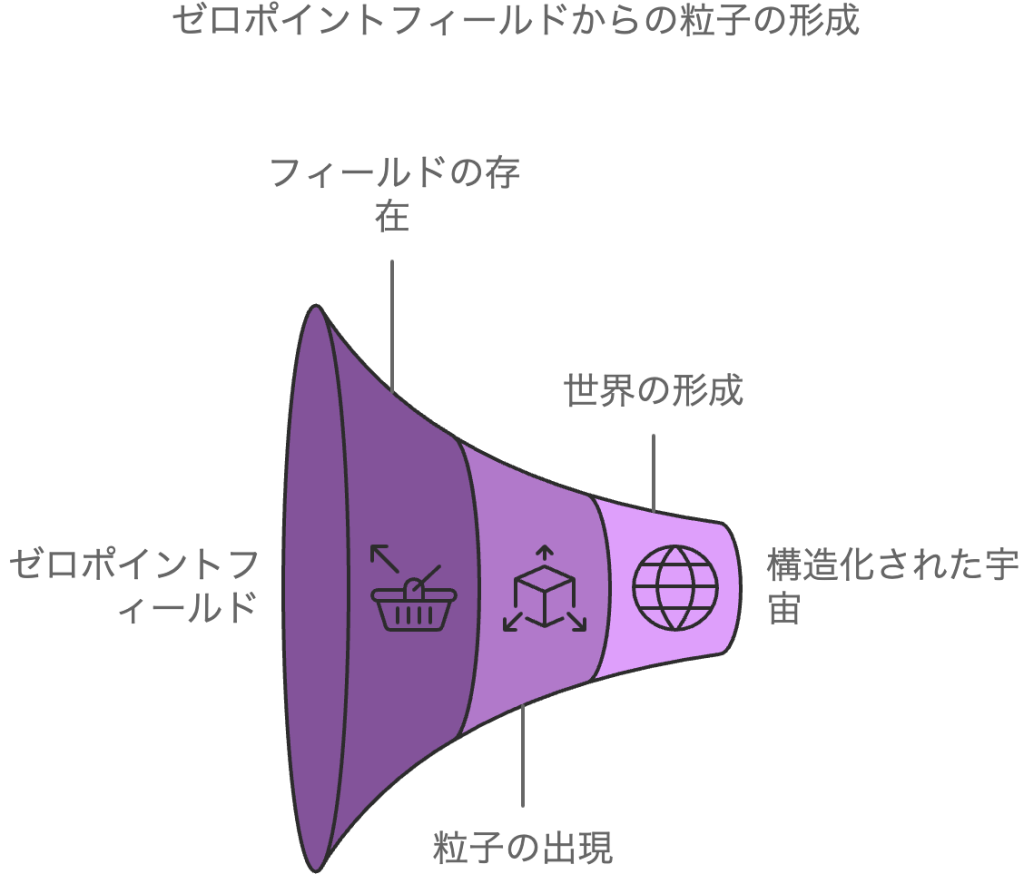 素粒子は「ゼロポイントフィールド」から生まれてくると考えられています。このフィールドはどこにでも存在し、あなたの周りや体の中、そして宇宙にもあります。ゼロポイントフィールドが背景にあり、その上に粒子が集まり、世界を形成しているということです。